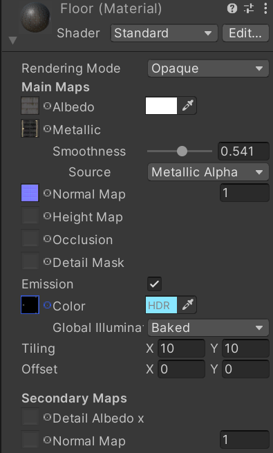머테리얼 -표면을 렌더링하는 방법( 텍스처에 대한 레퍼런스, 타일링 정보, 컬러 틴트 등을 포함)